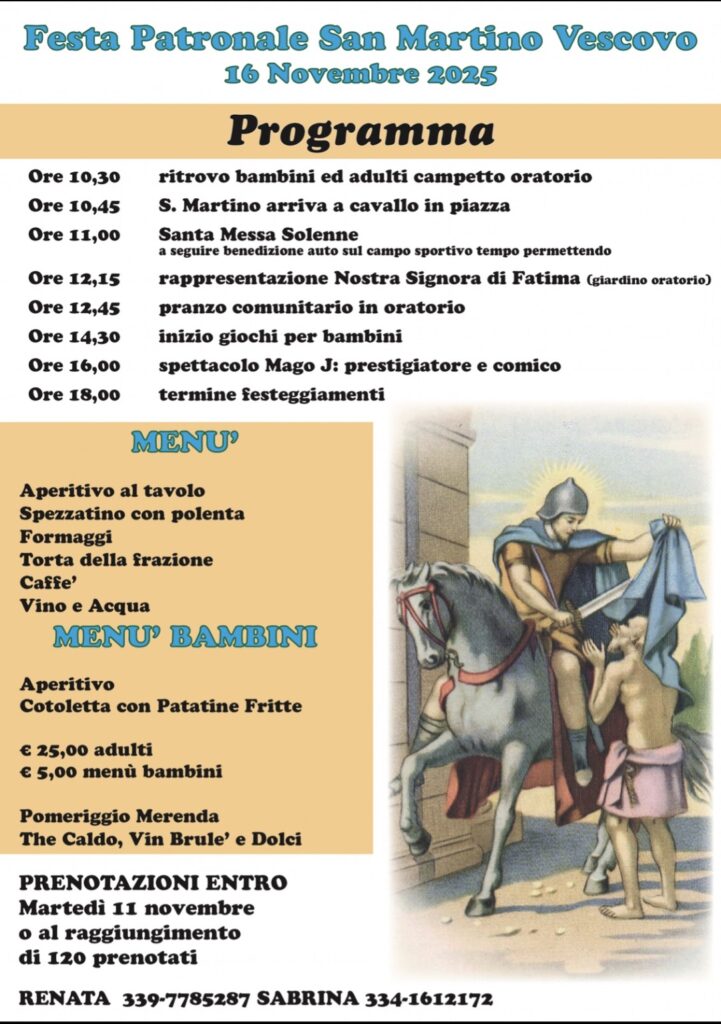 Aggiornato il 31 Ottobre 202531 Ottobre 2025Appuntamenti in primo piano S.Messe e celebrazioni liturgiche FESTA PATRONALE SAN MARTINO VESCOVO gm